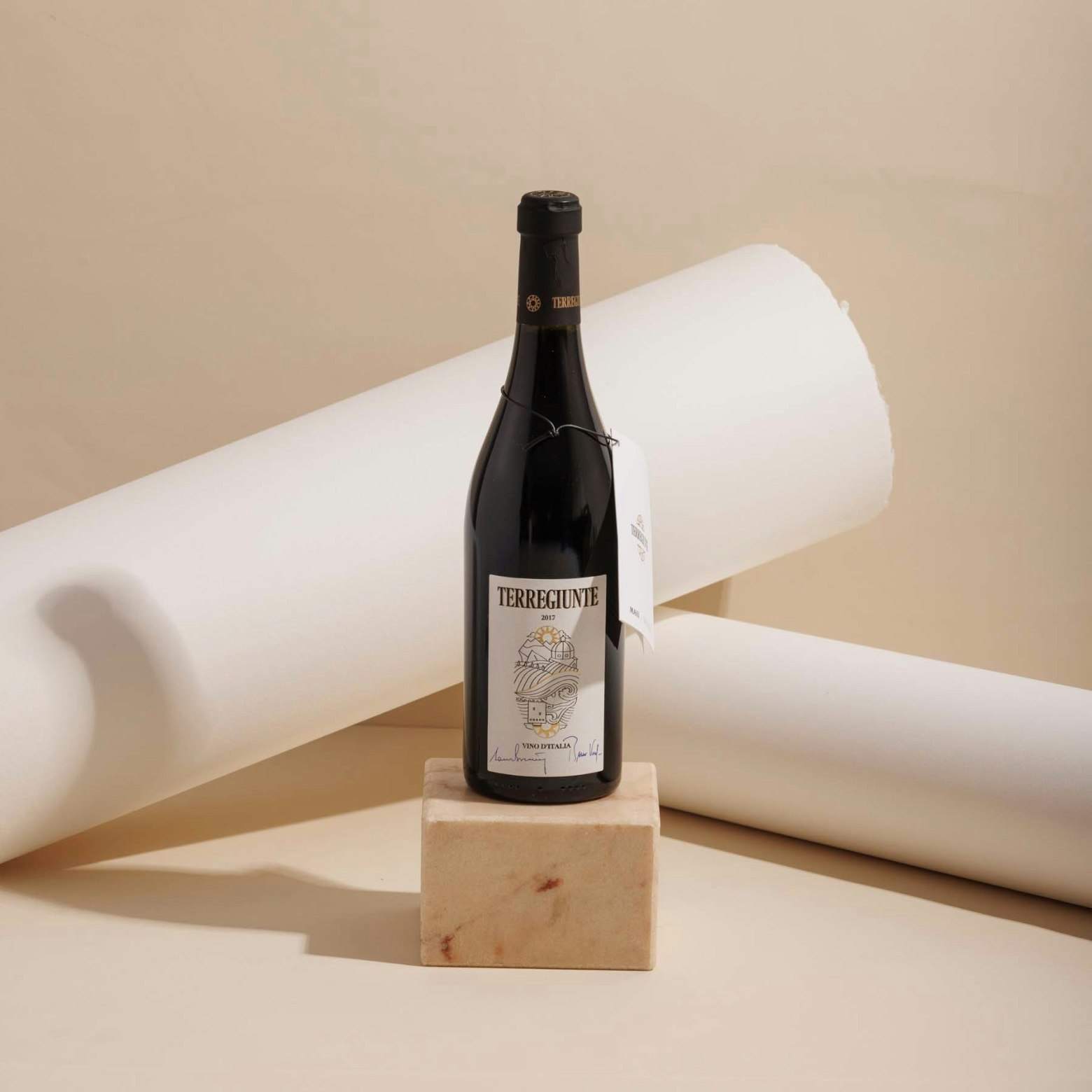 L'etichetta di Terregiunte è espressione di due mondi, due culture geograficamente agli antipodi, Nord e Sud. Due soli, calmo e riservato al nord, rovente e vibrante al sud, illuminano rispettivamente la cupola di Marano di Valpolicella e la Torre Burraco di Manduria, al centro le onde del Mar Ionio si fondono con le colline ai piedi dall'Alpe.