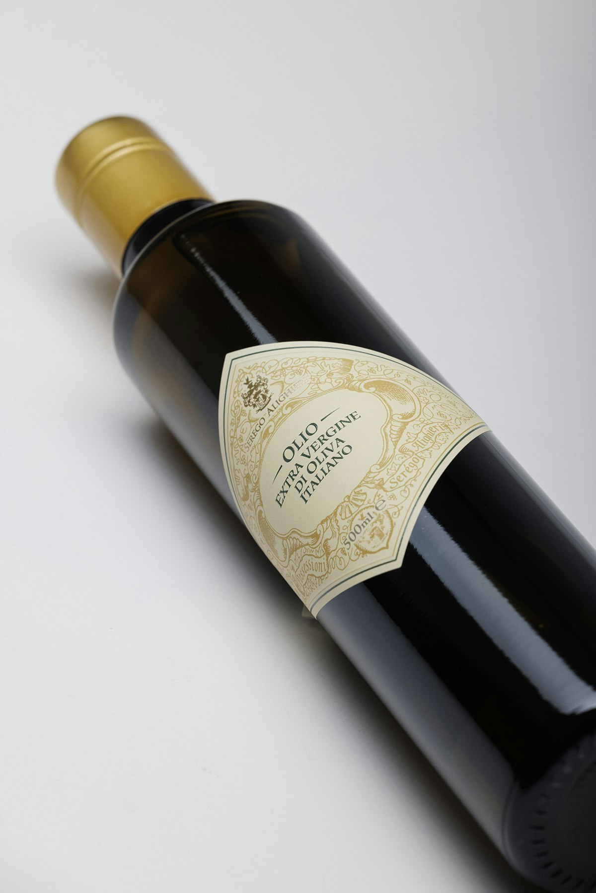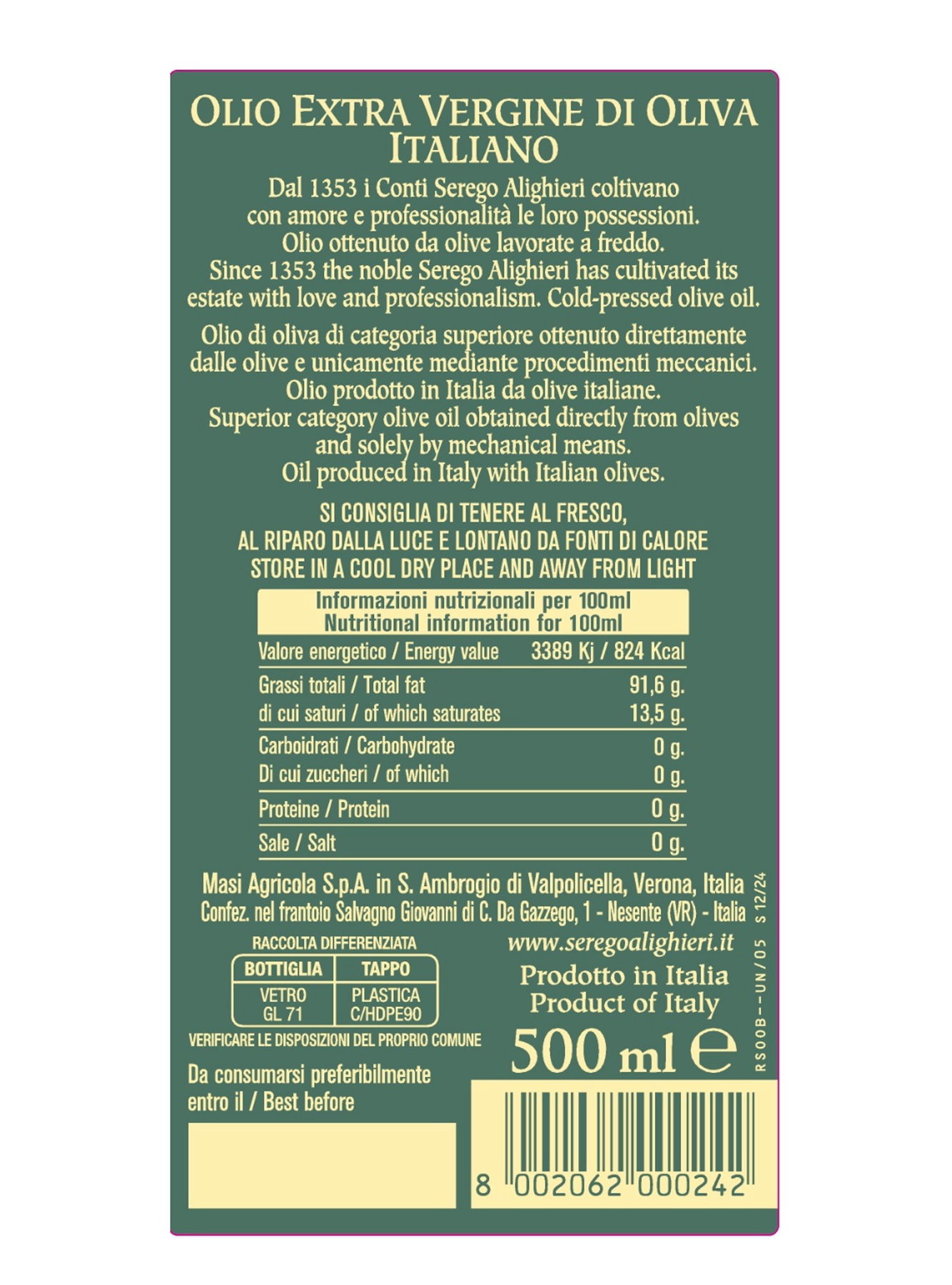 Extra-virgin olive oil with delicate, fruity and spicy taste. The olives, hand-picked, are pressed using ancient granite millstone wheels called "molazze". The Counts Serego Alighieri, descendants of the poet Dante, passionately cultivate their estate in the hills of the Valpolicella Classica.